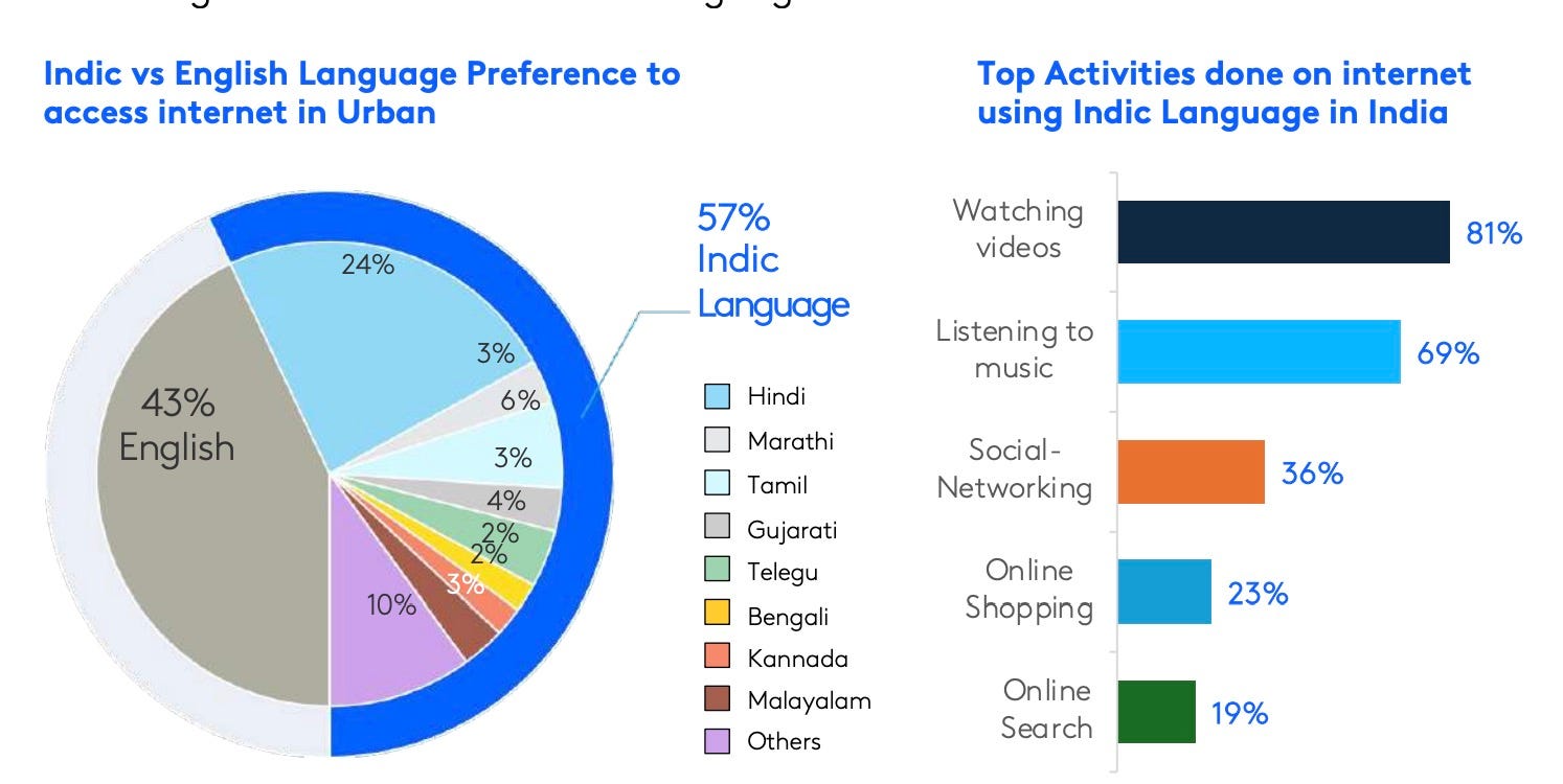 Indian internet users’ primary activity is consuming videos. It is also the top activity for language-specific internet activity. While Hindi represents a bigger chunk, other languages also form 33% of the country's internet consumption cluster.